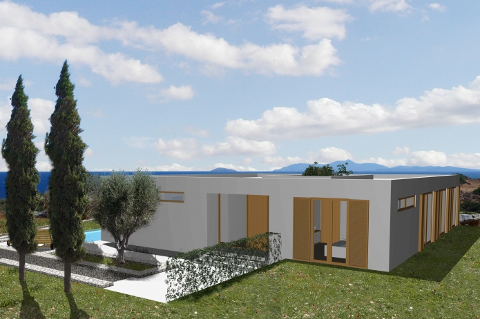 Das Haus organisiert sich U-förmig um einen teilweise überdachten Patio, der sich Richtung Westen öffnet. Dieser geschützte Freibereich im Herzen des Hauses schafft interessante Blickbeziehungen im Haus und eine zusätzliche Belichtung der angrenzenden Räume. Beim Betreten des Hauses fällt der Blick zunächst auf die beiden Bäume im Patio. Der Eingangsbereich verbindet den Wohnbereich im südlichen Schenkel, den Schlafbereich mit 3 Schlafzimmern und einem großzügigen Badezimmer im nördlichen Schenkel sowie dem Gäste-WC mit Dusche. Beim Betreten des Wohnbereichs mit Wohnzimmer, Esszimmer, Küche und Vorratsraum öffnet sich nun der Blick durch die raumhohe Glasfassade Richtung Süden zur überdachten Terrasse mit Blick über den Pool auf das Meer.