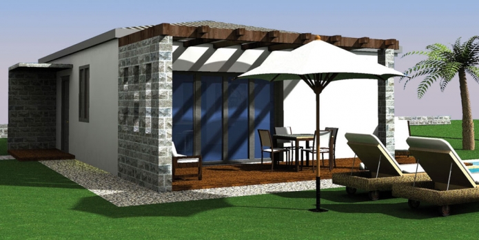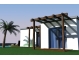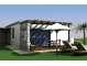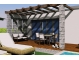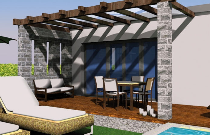 • Holzpergola über 32 m² der Terrassenflächen mit Sonnensegel aus Stoff