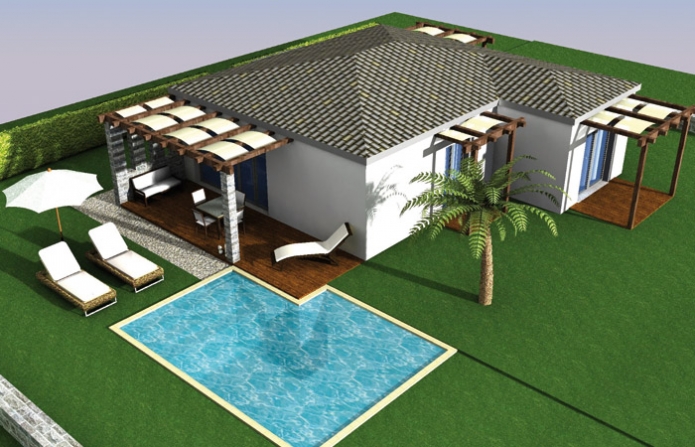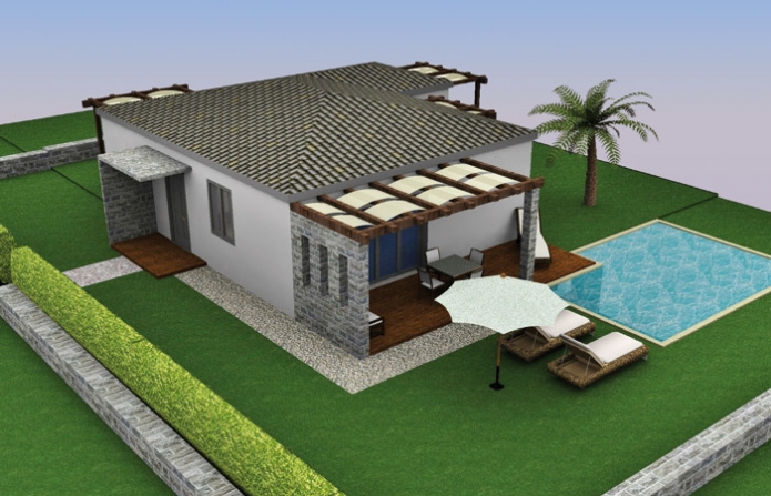 - Holzpergola über 32 m² der Terrassenflächen mit Sonnensegel aus Stoff