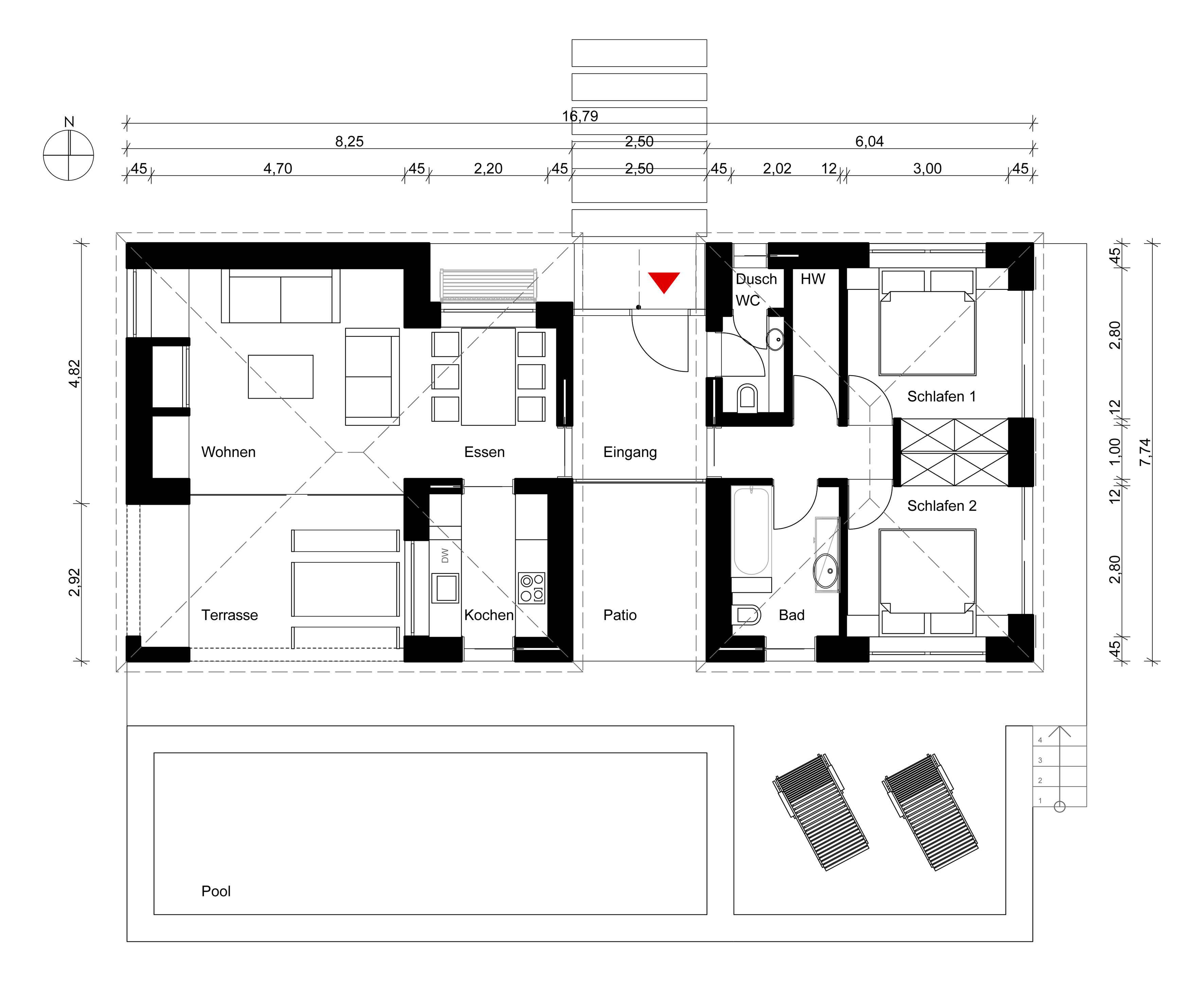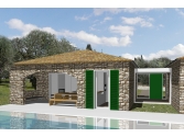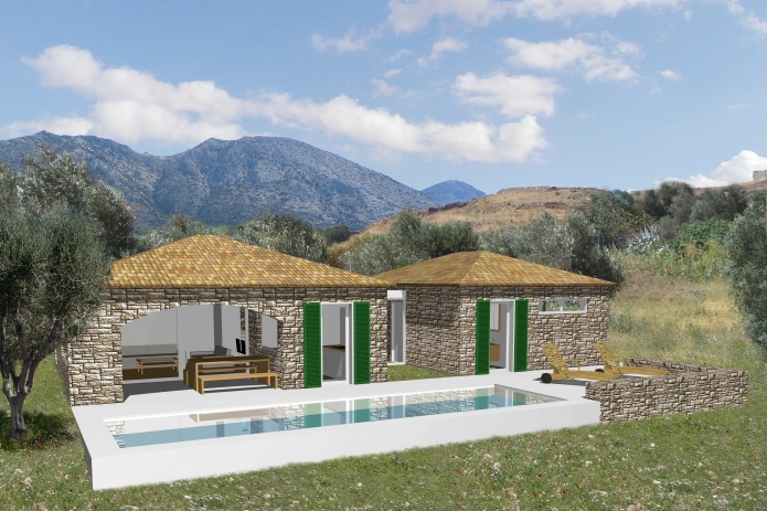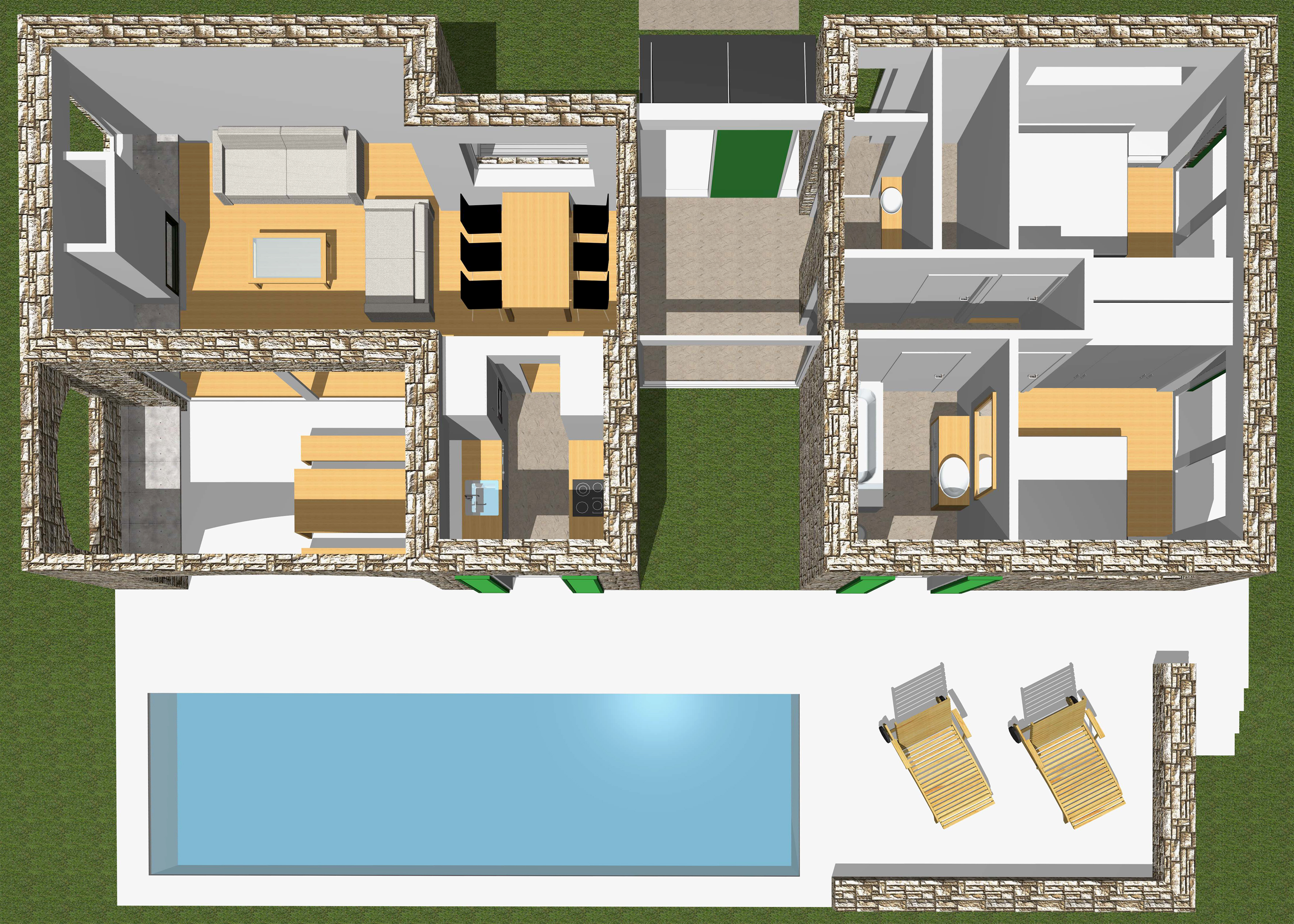 Das Haus Ortansia gliedert sich in ein Wohn- und ein Schlafhaus, die durch die Eingangsschleuse miteinander verbunden sind. Beim Betreten des Hauses öffnet sich der Blick auf einen kleinen Patio, den dahinterliegenden Außenpool und das Meer. Von hier werden Wohn- und Schlafhaus und das Dusch-WC erschlossen. Der angrenzende Wohn-Essraum mit abtrennbarer Küche öffnet sich zu einer überdachten Terrasse. Durch das Fenster neben dem offenen Kamin wird die Abendsonne eingefangen. Die beiden Schlafräume sind nach Osten orientiert (Morgensonne). Das Badezimmer hat einen direkten Zugang zum Poolbereich.