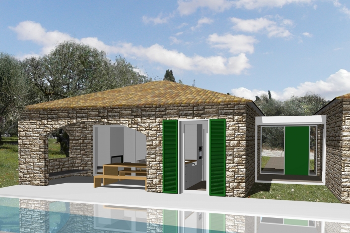 Das Haus Ortansia gliedert sich in ein Wohn- und ein Schlafhaus, die durch die Eingangsschleuse miteinander verbunden sind. Beim Betreten des Hauses öffnet sich der Blick auf einen kleinen Patio, den dahinterliegenden Außenpool und das Meer. Von hier werden Wohn- und Schlafhaus und das Dusch-WC erschlossen. Der angrenzende Wohn-Essraum mit abtrennbarer Küche öffnet sich zu einer überdachten Terrasse. Durch das Fenster neben dem offenen Kamin wird die Abendsonne eingefangen. Die beiden Schlafräume sind nach Osten orientiert (Morgensonne). Das Badezimmer hat einen direkten Zugang zum Poolbereich.