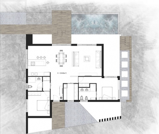 - Bauhaus-Stil auf einer Etage - 128 m² Bruttofläche - großer, offener und heller Wohn-Ess-Küchenbereich - zwei geräumige Schlafzimmer, wovon eines als Bad en Suite kreiert worden ist - separates Gäste-WC - großer Abstellraum - große Terrassenflächen auf zwei Ebenen - beleuchtet mit Boden- und Deckenspots - direkt an das Haus gebauter Swimmingpool